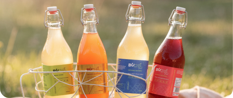 Kombuchas, Sucos com SuperFoods, Chás Drenantes, Iogurte de Kefir e Shots Matinais com cúrcuma, limão e gengibre.